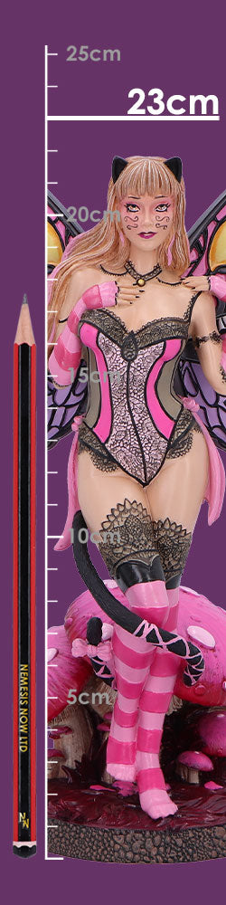 Delve into Wonderland with our exclusive Cheshire Cat fairy, part of Nemesis Now's Wonderland Fairies collection. Adorned with unique wings featuring the Cheshire Cat's eyes and grin, she wears an intricate pink lace bodysuit and striped stockings, standing amidst pink spotty mushrooms. Packaged in a branded gift box, Cheshire Cat is perfect for Alice in Wonderland fans or lovers of eccentricity.
