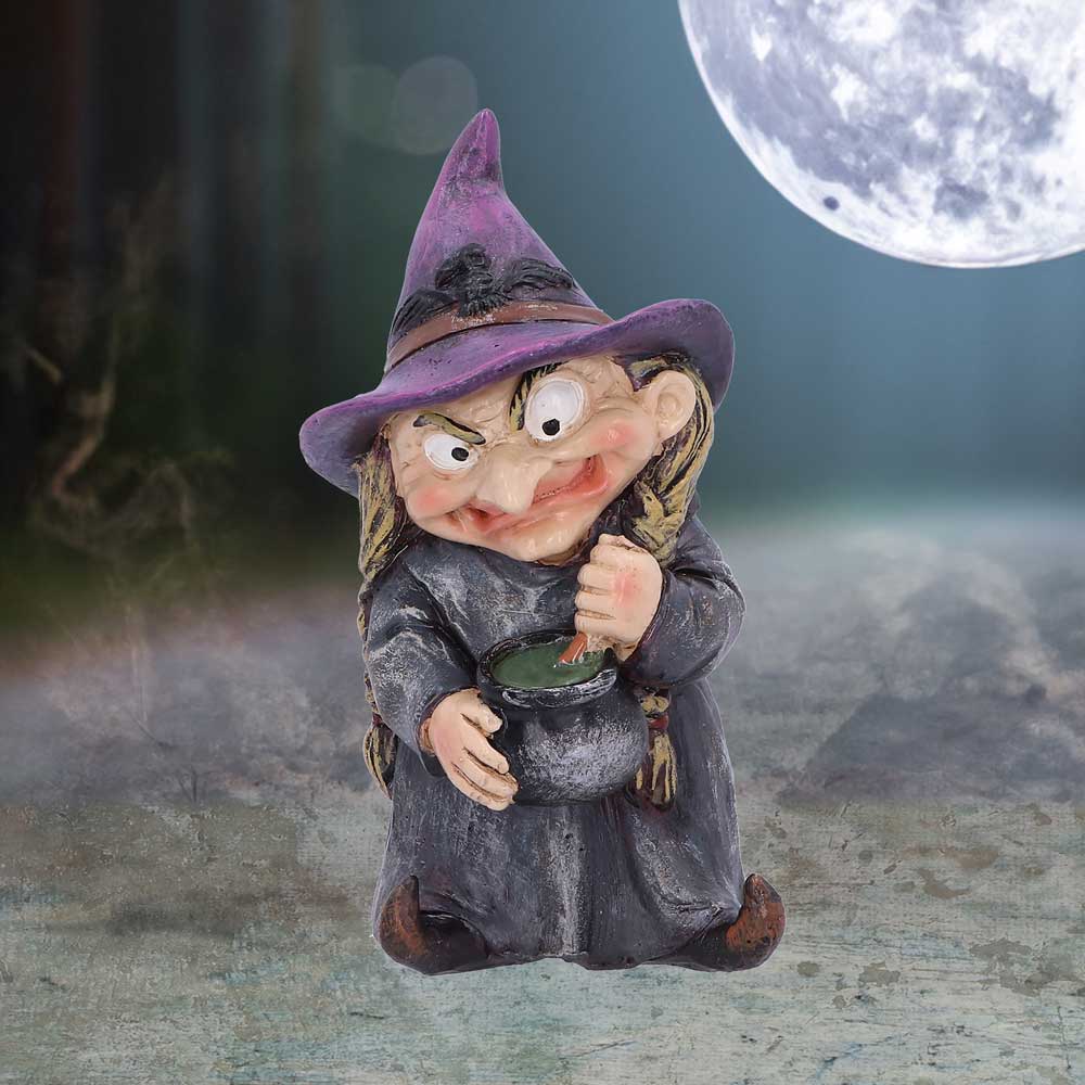 This little witch really is a nasty one. Standing upright, with cauldron in-hand, she stirs the mysterious green liquid. Wearing a purple witches hat, long black robes and curled witches shoes. Their is no doubt that this grotesque witch is up to no good. Cast in the finest resin before being hand-painted, this unsightly little witch would make a great addition to any witch collection.