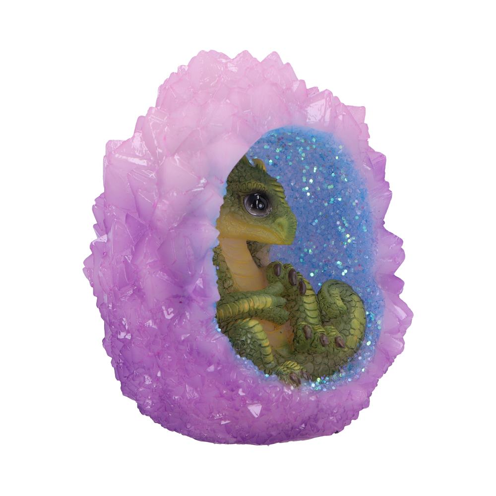 Illuminate your space with mystical charm using our Geode Nest (Green) figurine, a whimsical creation from Nemesis Now's value collection. This adorable green dragonling, with large and entrancing eyes, finds solace within the protective embrace of a vibrant purple and blue crystal geode. The crystal is designed to light up, (batteries required), casting a soothing blue glow from the dragonling's heart center. Crafted from the finest resin and hand-painted with meticulous care, this figurine seamlessly combines enchanting style with magical allure. Explore our extensive collection of dragon-themed giftware, perfect for those who have a deep appreciation for magical creatures. Light up your room and immerse yourself in the enchantment of this delightful Geode Nest (Green). Add this extraordinary piece to your collection. Explore more from Nemesis Now.