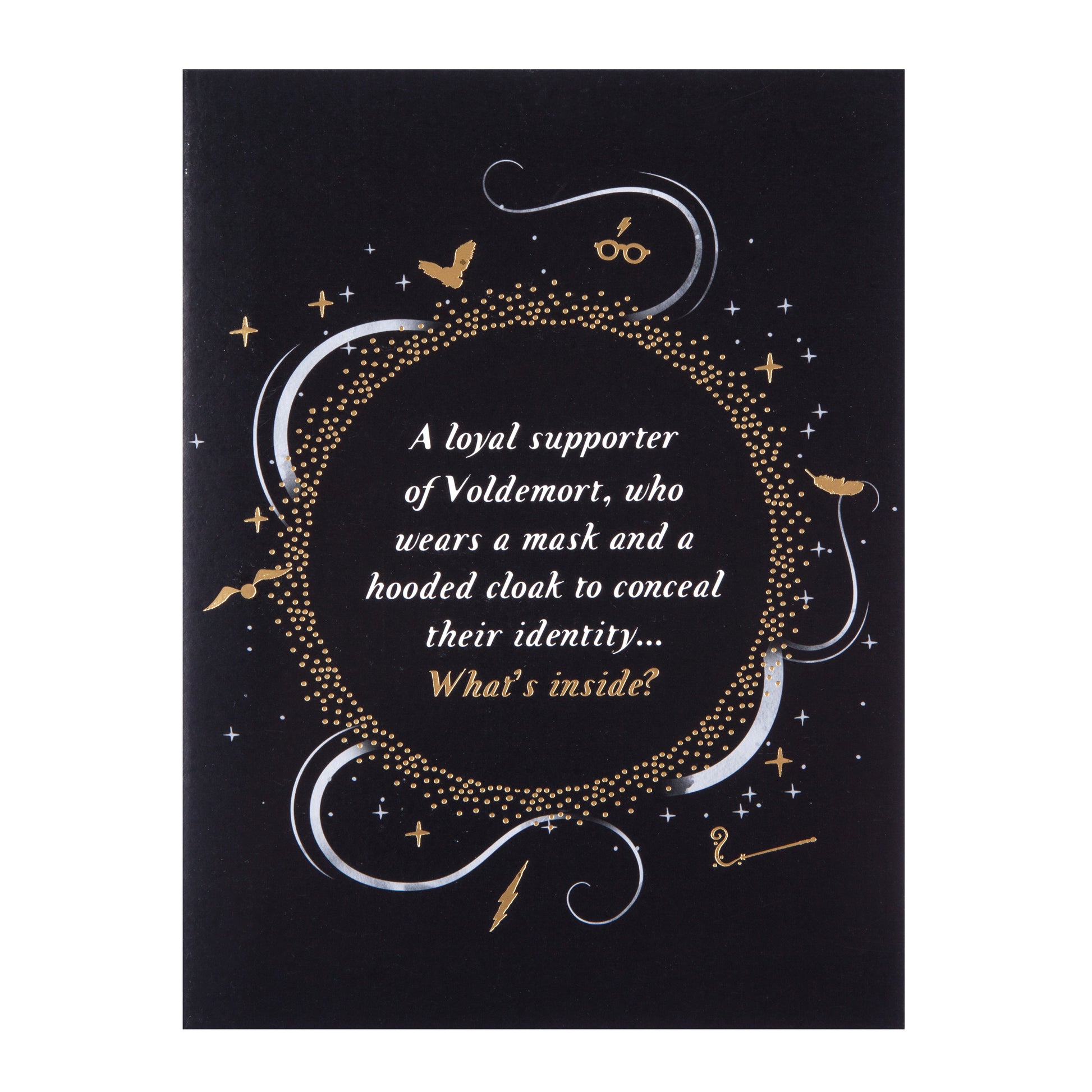 The Cover reads "A Loyal Supporter of Voldemort, who wears a mask and a hooded cloak to conceal their identity...what's inside?" eluding to dark magic inside.