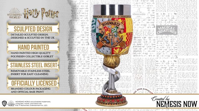 With this superbly created Golden Snitch collectable Goblet, you can show your devotion for Quidditch. The Golden Snitch, often known as the Snitch, is the third and smallest Quidditch ball. It's a gold-colored spherical the size of a walnut with silver wings. It flies fast around the Quidditch pitch, halting and lingering in position at times. The purpose of the Seeker is to catch the Snitch before the other team's seeker, which is worth 150 points. The game can only come to an end when the Snitch is caught! On this exquisitely constructed Goblet, the Snitch serves as an attractive stem, and the Hogwarts emblem is prominently etched on the front. This item is the perfect addition to any wizarding collection and may be appreciated by witches, wizards, and Muggles alike. It is cast in the finest resin before being magically hand-painted.