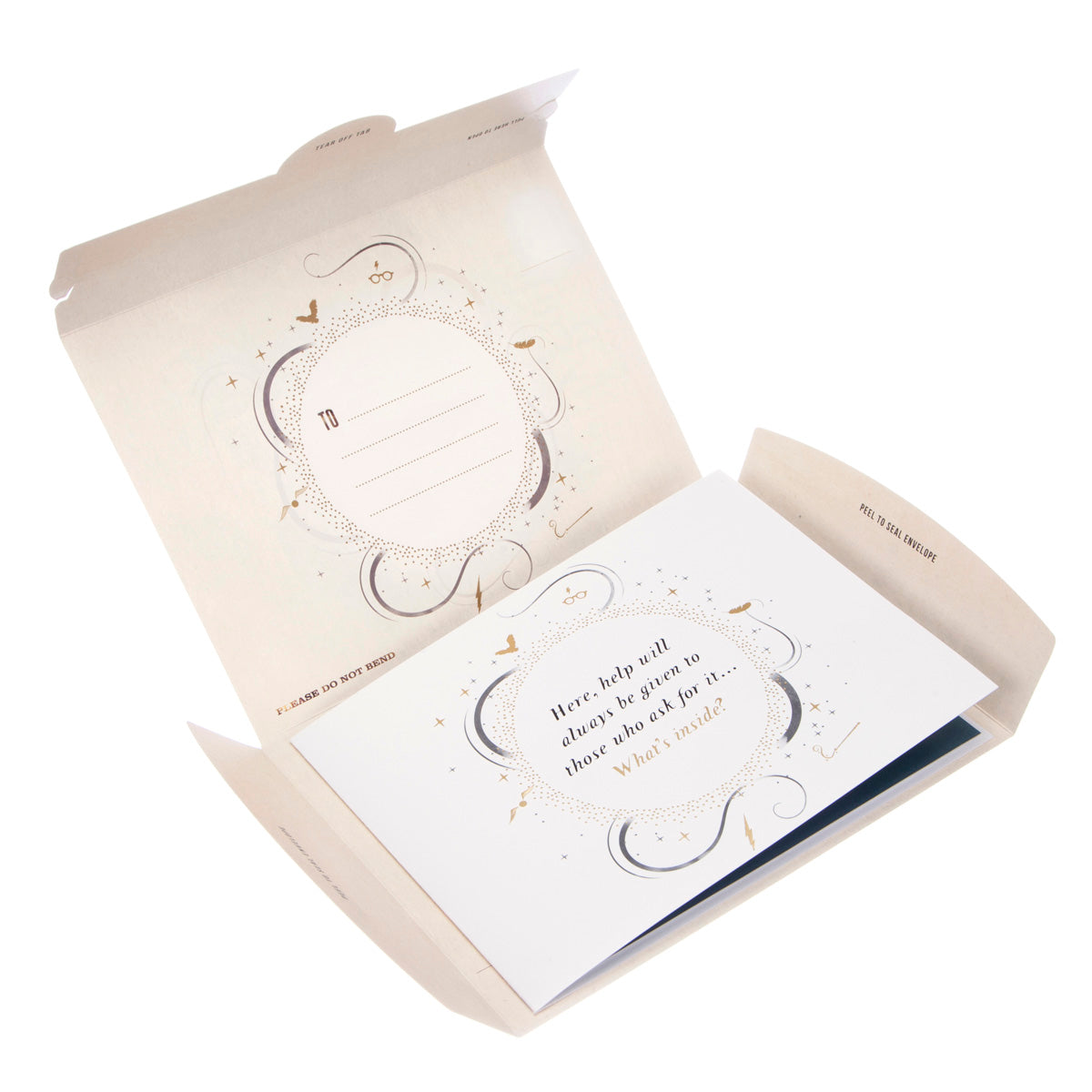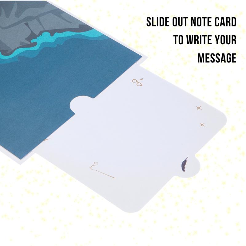 This card includes a notecard that keeps allows you to write your special message but keep it hidden when the card is on display. Our revolutionary reversible packaging magically transforms into a Hogwarts envelope, making this a magical gift experience from the moment your loved ones receives their mail!