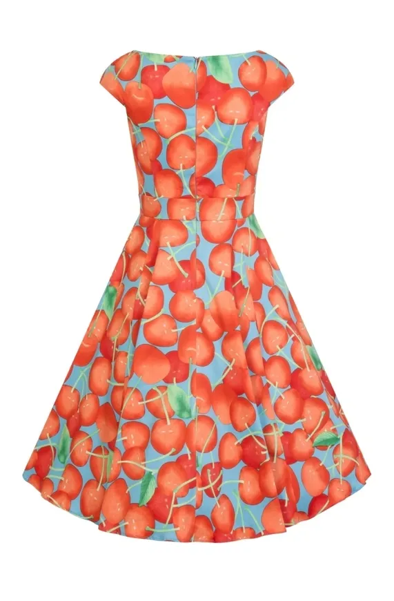 The Royal Ann Cherry dress is completely covered in cherries. The dress is made of a cotton-blend fabric with a simple v-neckline and a fitted bodice that flows into a full-effect swing skirt. Its cap sleeves and bodice are made of a single fabric cut, resulting in a flawless style and fit.