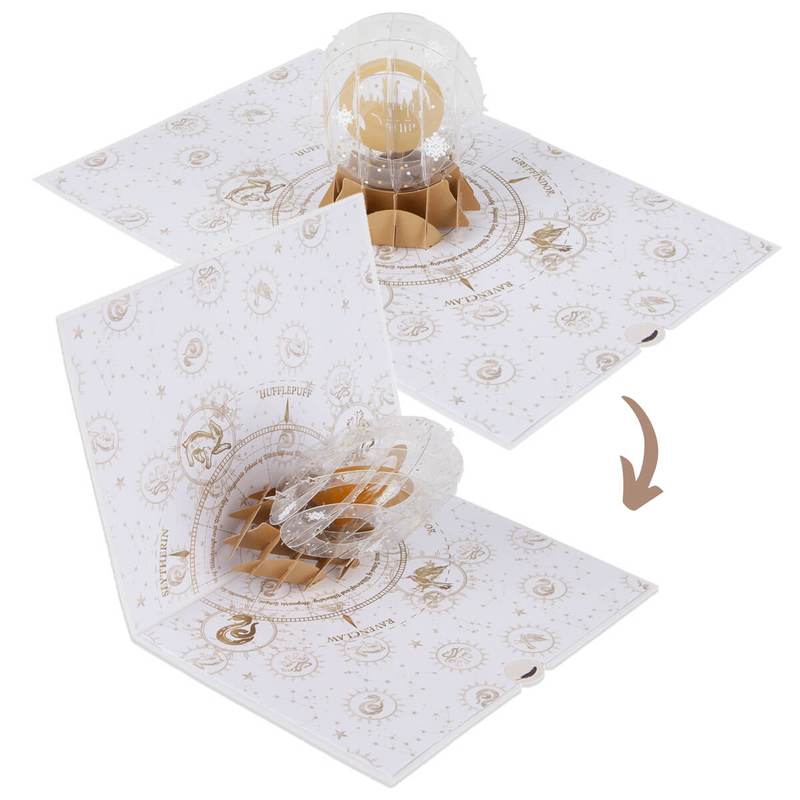 The Yule Ball Cover opens up to reveal a stunning snowglobe with a silhouette of Hogwarts Castle in the middle. The globe itself is transparent with silver silk printing of snowflakes, really making this card more beautiful and magical than ever!