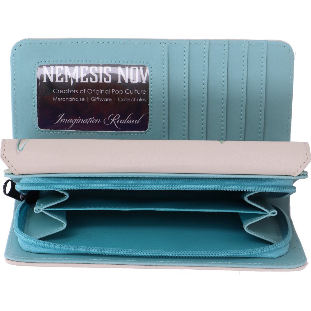 - Features detailed embossed highland cow artwork, delicate flower motifs, durable leather, a zip-around closure, and a sky-blue interior with compartments for cards and coins.