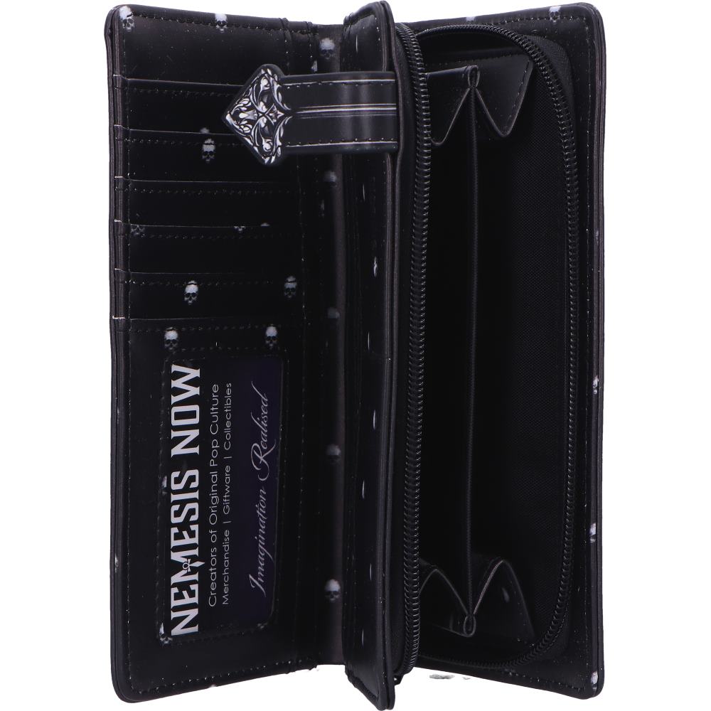 The Baroque Skull Embossed Purse is a striking accessory featuring ornate gothic artwork and dramatic skull motifs, perfect for lovers of alternative fashion. Crafted from durable materials, it includes a zip-around closure, multiple card slots, and a zipped coin pocket for practical use. Packaged in a protective polybag, it's ideal for gifting or personal use. Designed for gothic enthusiasts and fans of edgy accessories, this purse is a unique blend of dark elegance and everyday functionality.