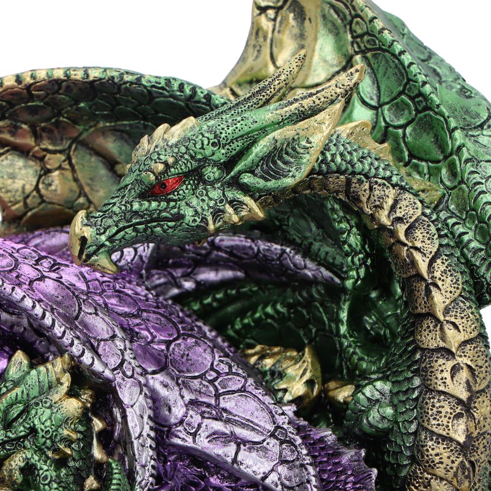 The Precious Hoard is a beautifully crafted resin statue of a dragon family. The father dragon in green keeps a watchful eye, while the purple mother dragon cradles her baby in her protective arms. The glowing orange eyes of the father dragon create a striking visual, making this piece a perfect addition to any fantasy collection. A great item for retailers looking to add to their dragon-themed offerings.