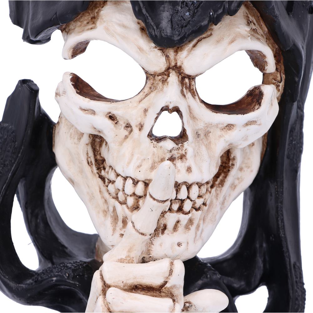 The physical personification of death, this Hush Reaper will hauntingly silence you and guide your soul into the afterlife. His skeletal hand brings one finger to an evil grinning mouth whilst engulfed in a shredded long black hooded-cloak. Cast in the finest resin before being expertly hand-painted, this Hush Reaper will make the perfect addition to any Gothic collection.