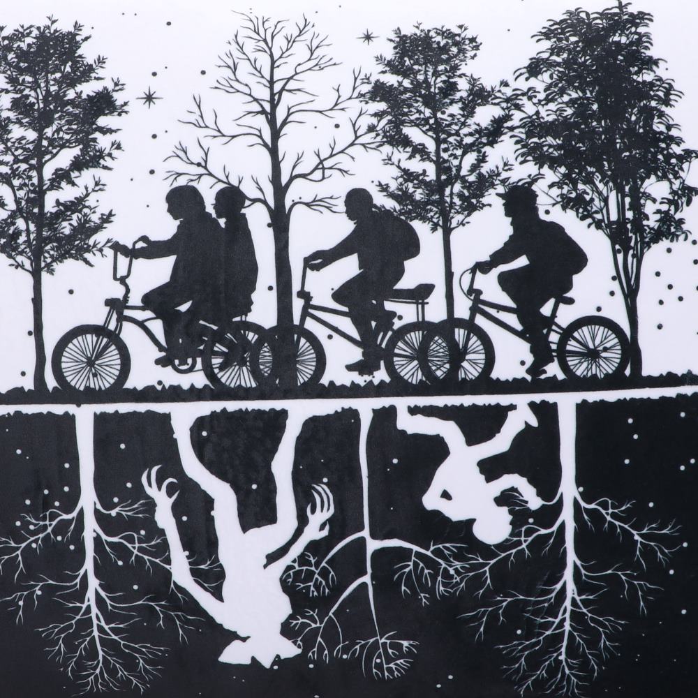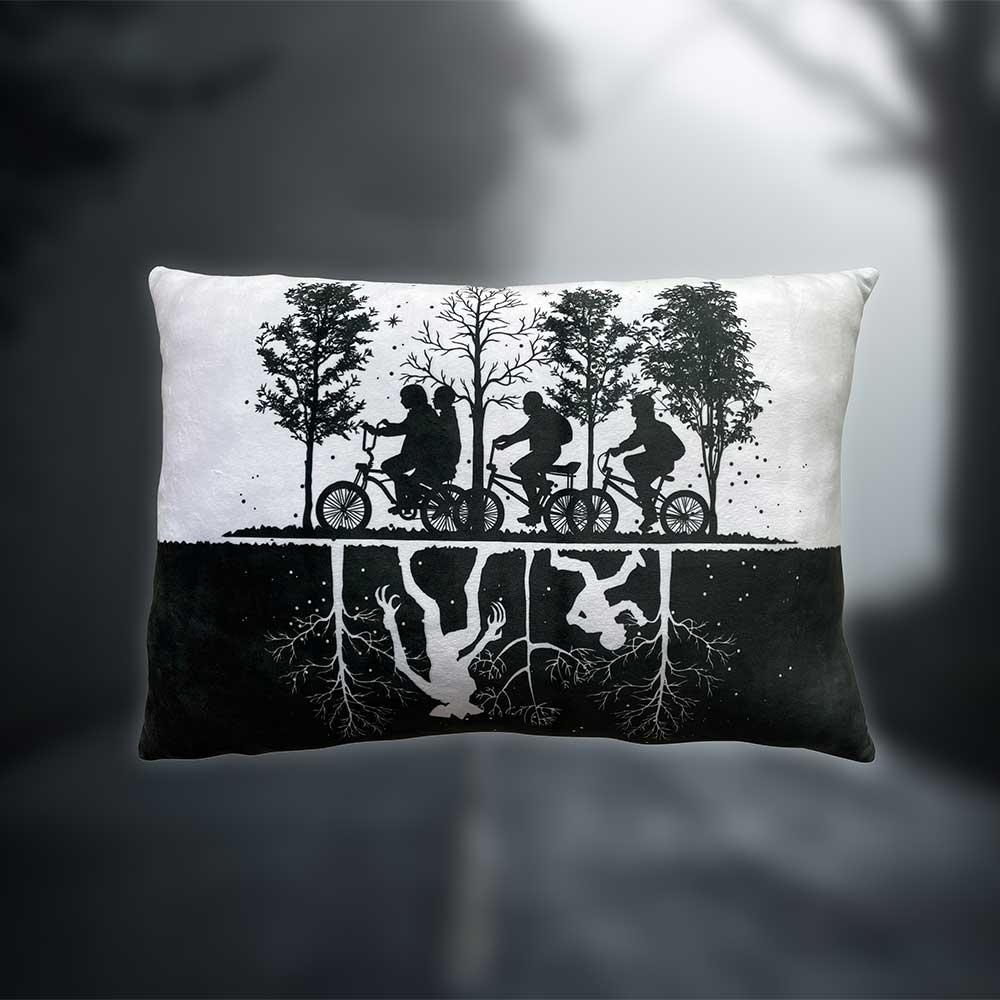 Be transported to the Upside Down with this Stranger Things Cushion. Featuring Will, Eleven, Dustin and Lucas's silhouttes as they ride their bikes through Hawkins in search of their missing friend Will. Will can be seen on the other half of the Cushion running away from a Demogorgon in the Upside Down. Luxuriously soft, this cushion is perfect to snuggle up and binge your favourite Stranger Things episodes.