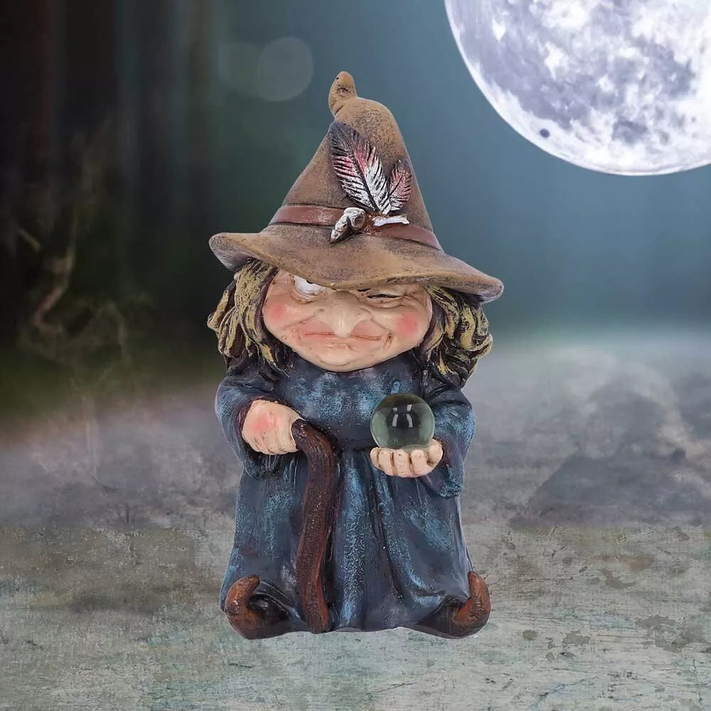 Meet the Wickedly Nasty Little Witch: A Bewitching Addition to Your Collection. With an Upright Stance and Clutched Walking Stick, She Casts a Disgusted Glance Ahead. Dressed in Long Blue Robes and a Beige Witches Hat, She Exudes an Aura of Darkness. Holding a Crystal Ball, She Foresees a Bleak Future for All Who Cross Her Path. Crafted from Premium Resin and Meticulously Hand-Painted, This Unsightly Statuette is a Must-Have for Witching Enthusiasts. Embrace the Dark Side! Add this Wicked Little Witch to Your Collection and Unleash the Mystical Forces of Fantasy.