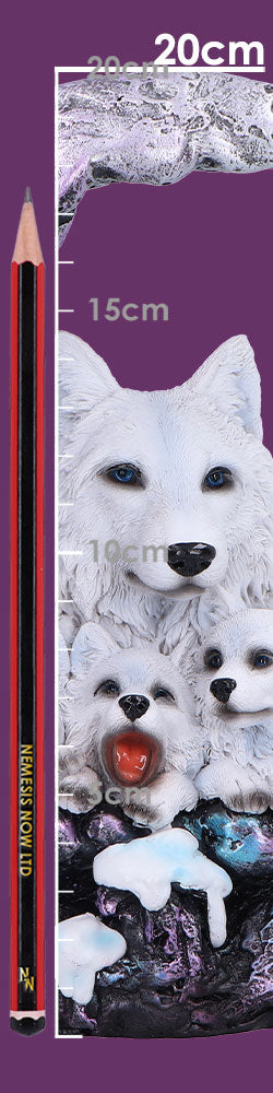 Winter Moon is a captivating figurine featuring four wolf pups nestled peacefully in a crescent moon, with a protective adult wolf standing guard. The crescent moons shimmering purple, blue, and silver tones, along with the snow-covered surface, create a serene, mystical scene. Sculpted from high-quality resin, the piece beautifully captures the soft texture of the pups fur and the sleek coat of the adult wolf. Packaged securely for protection, its perfect for display in gift shops or nature-themed stores. With its enchanting design and emotional appeal, Winter Moon will resonate with wildlife lovers and collectors.